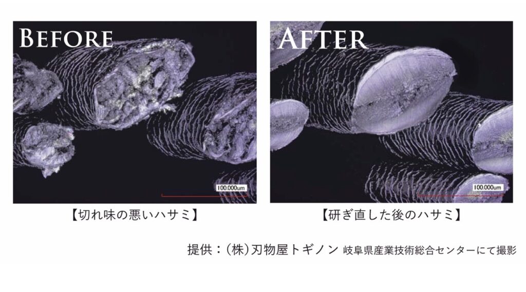 刃が鈍っているハサミで髪を切るのは、研いでいない包丁では繊細な食材を切ることができないのと同じ。引きちぎったような断面になってしまいます。またスムーズに動かないと細部にもこだわりを発揮しずらくなってしまいます。