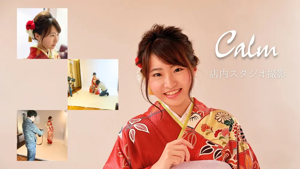 一番の特徴は美容室Calmとコラボで撮影出来ますのでヘアー、メイク、着付けのアレンジが可能です。